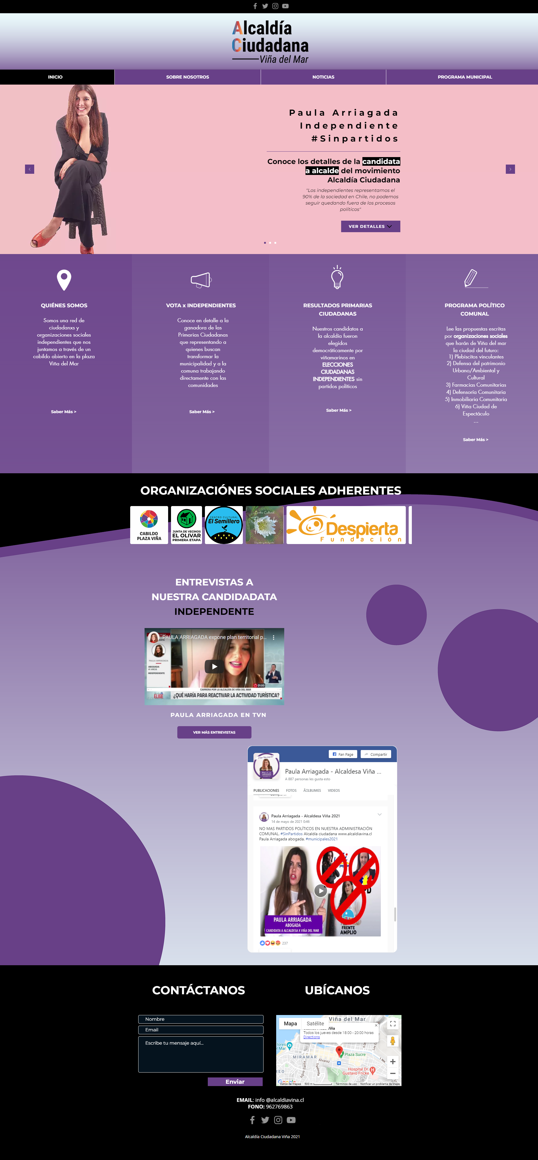 Esta página web fue desarrollada por mi para la candidatura política-independiente de Paula Arriagada, representante del movimiento Alcaldía Ciudadana y Cabildo Plaza Viña, para las Elecciones Municipales Viña 2021