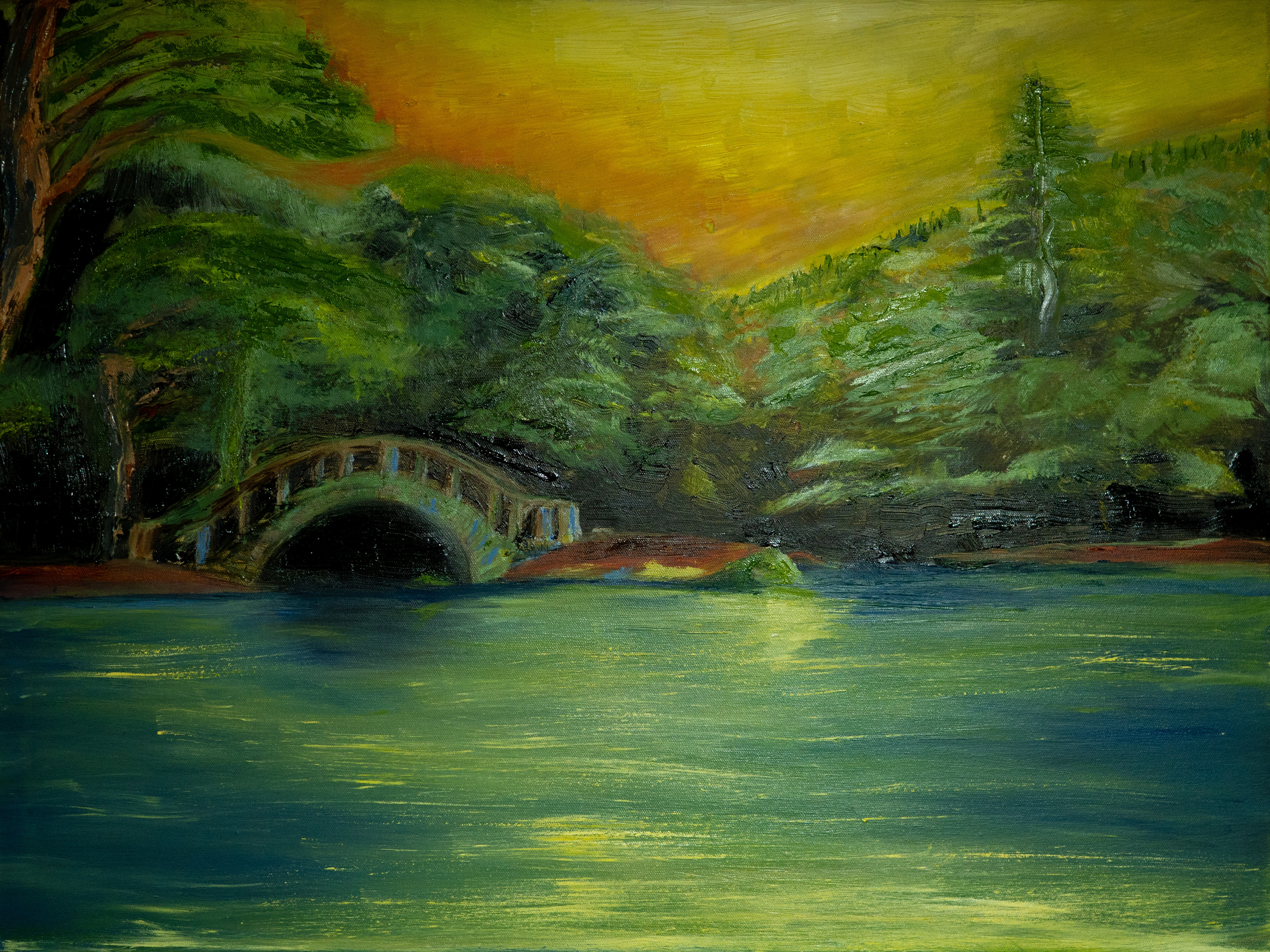 Cuando ocurrió la desgracia que azotó a mi población afectando las viviendas de mi familia, amigos y vecinos, tuve que huir para sobrevivir, por milagro estoy vivo y mi vivienda no se quemó, muchos no pueden contar el mismo relato. Al retornar a mi comunidad, unas horas después, estuvimos meses sin luz, ni servicios básicos, estando durante 1 mes quedándome a oscuras en mi departamento, para protegerlo de los ladrones, ya que no había nadie quedándose alrededor, por miedo a otro incendio. Al volver la luz, lo primero que noto al entrar a mi hogar es precisamente esta pintura. Mi idea original era hacer un atardecer en el Jardín Botánico (que está frente a mi población), pero jamás imaginé que ese cielo rojo podría representar algo tan catastrófico como un incendio... me quedé pasmado. El incendio quemó un gran porcentaje del Jardín Botánico y una de las pocas zonas que se salvó intacta fue esa laguna.